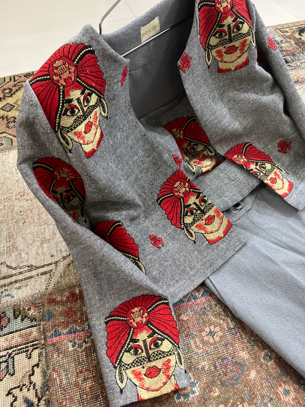 کت و شلوار لنین طرح دار همراه با تاپ دکلتهسایز ۴۴ ۴۶